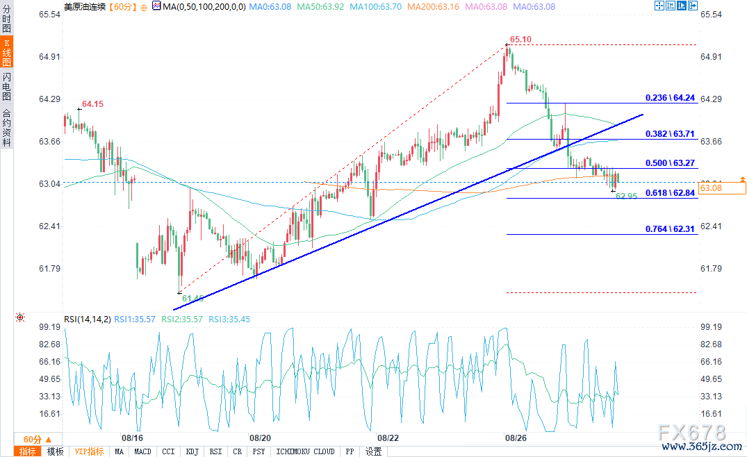 WTI1小时走势图上,油价未能破碎65.00好意思元关隘,并开动新一轮下落,跌破64.50好意思元。